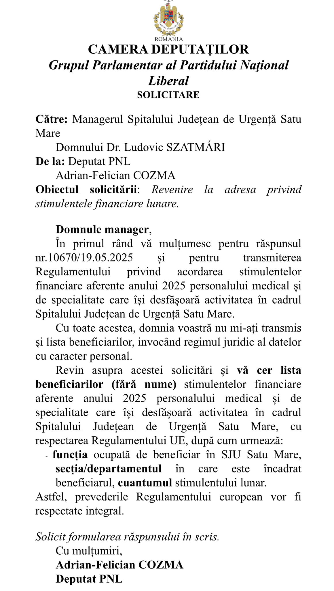El nu se lasă și a mai transmis conducerii spitalului o nouă cerere oficială, de la cabinetul său de parlamentar, la care managerul general este obligat, prin lege, să răspundă.