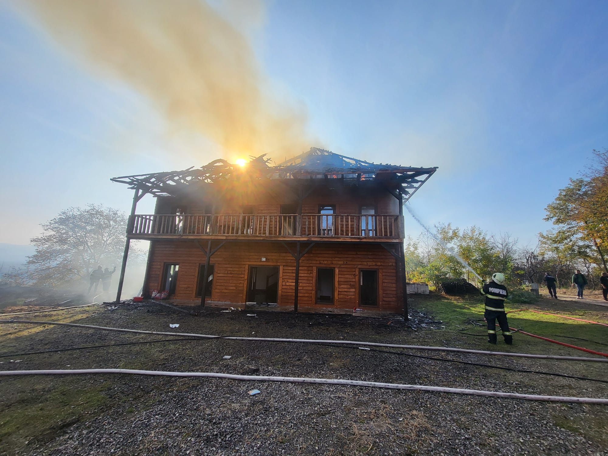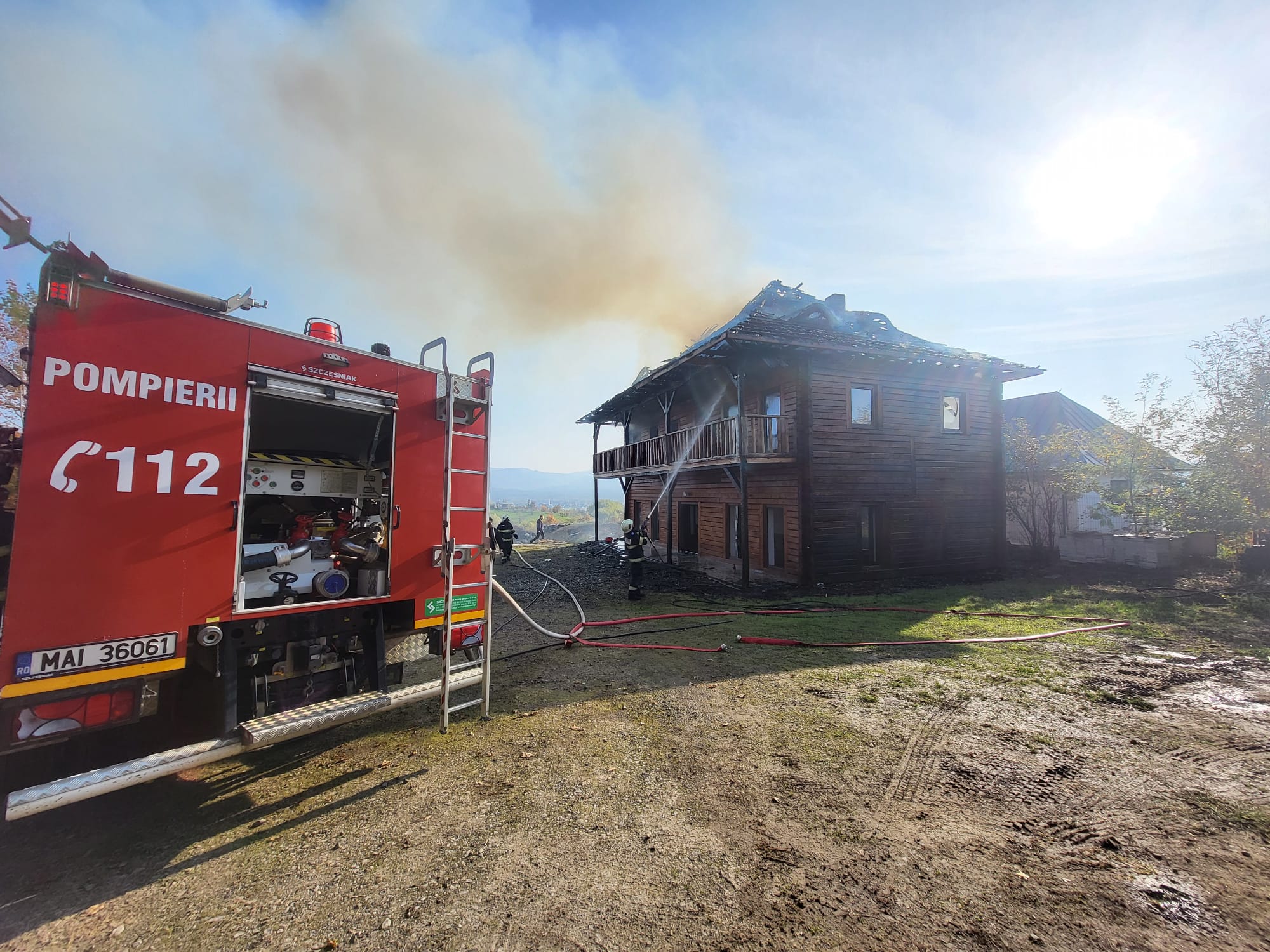 Ajunse la fața locului, echipajele de intervenție au constatat că incendiul se manifesta violent la nivelul acoperișului pe o suprafață de aproximativ 100m².