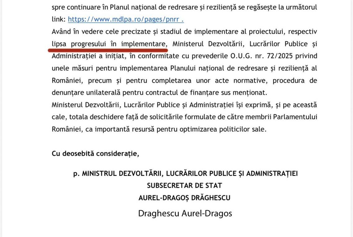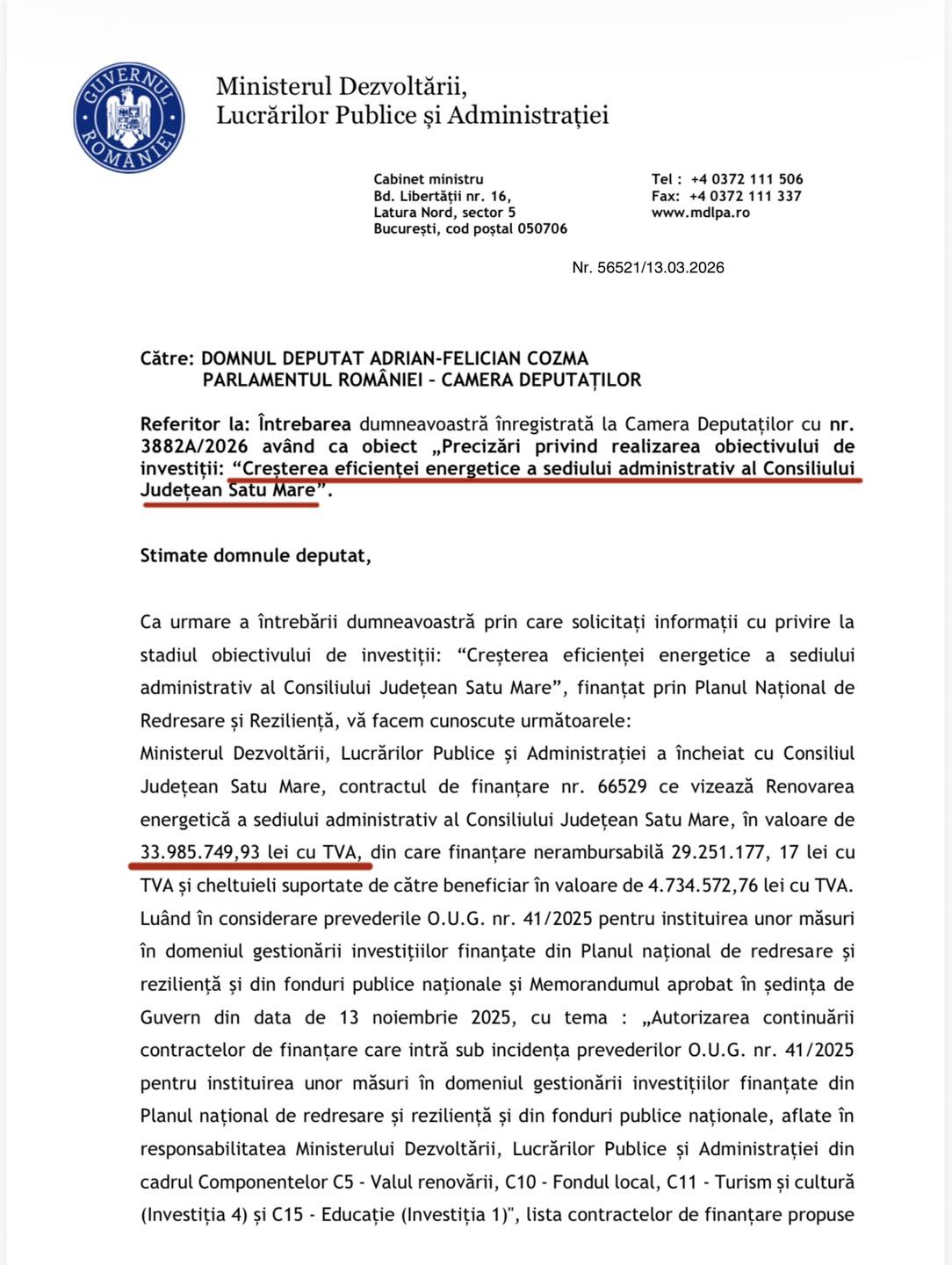 În concret, prin răspunsul oferit de Ministerul Dezvoltării la întrebarea formulată de subsemnatul cu privire la stadiul proiectului ”Creșterea eficienței energetice a sediului administrativ al Consiliului Județean Satu Mare”, nr. 56521,13.03.2026, am fost informat că proiectul în valoare de 33,98 milioane lei din care 29,2 milioane finanțare nerambursabilă s-a pierdut din cauza ”lipsei progresului în implementare”.