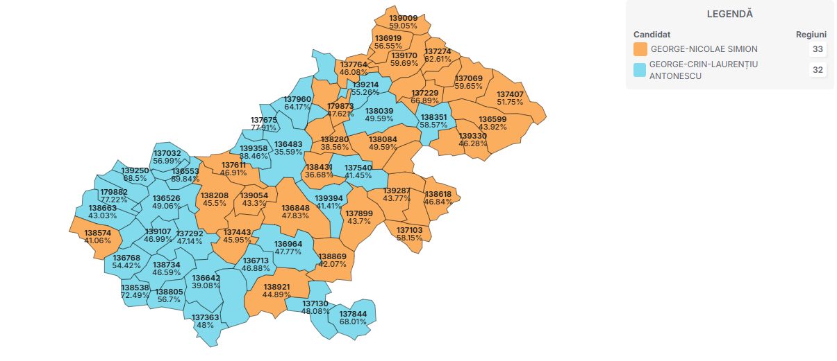 În ceea ce privește distribuția pe localități, se poate observa că George Simion a câștigat în microregiunile cu populație majoritar românească, în timp ce Crin Antonescu s-a impus în zonele cu populație mai degrabă maghiară sau mixtă.