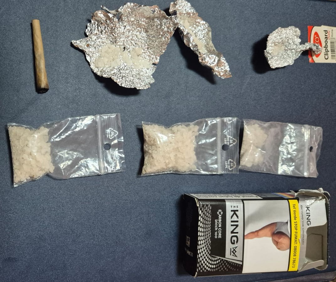 În urma legitimării, jandarmii au procedat la efectuarea uni control corporal al bărbatului, ocazie cu care au descoperit asupra sa trei pliculețe de tip Zip-lock transparente și 3 bucăți de folie de aluminiu ce conțineau o substanță albă-cristalină, susceptibilă a fi substanță interzisă, precum și o țigaretă confecționată artizanal, de tip joint, ce conținea o substanță galben-verzuie care avea un miros înțepător.