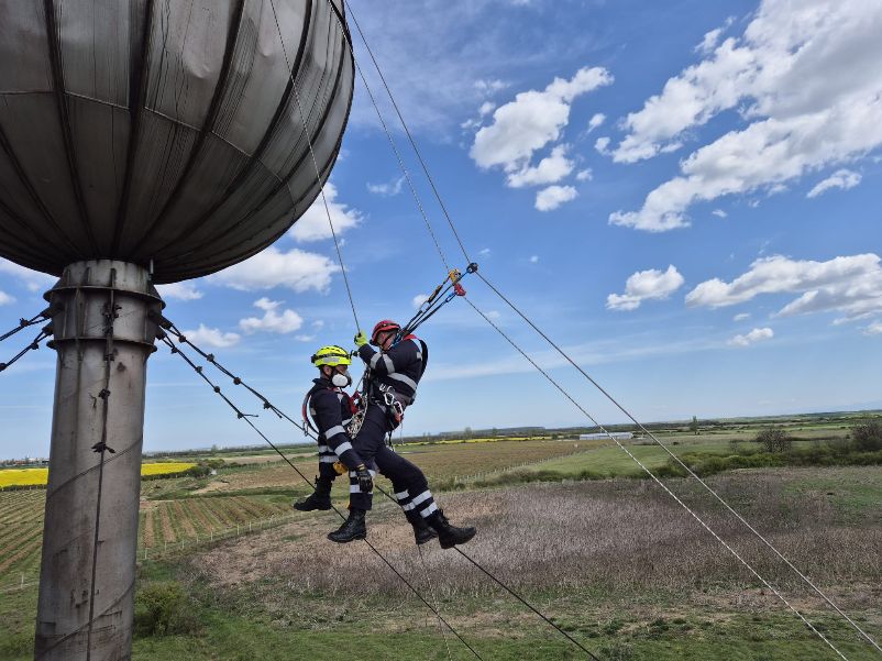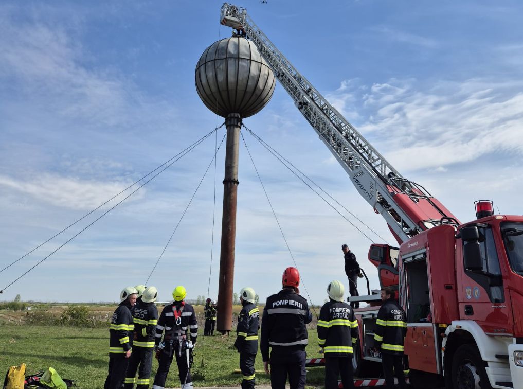 Oameni salvați dintr-un turn de apă și explozie prevenită la un rezervor de combustibil fisurat. Exerciții de amploare ale pompierilor sătmăreni