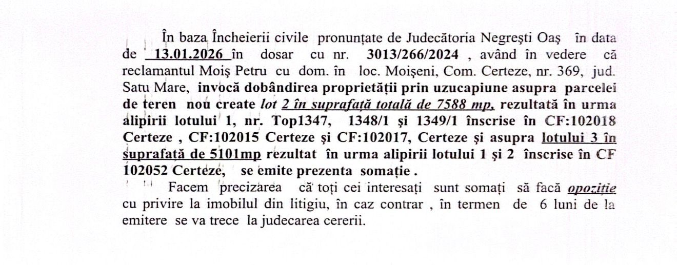 În baza Încheierii civile pronunțate de Judecătoria Negrești Oaș în data de 13.01.2026 în dosar cu nr. 3013/266/2024, având în vedere că reclamantul Moiș Petru cu dom. în loc. Moișeni, Com. Certeze, nr. 369, jud. Satu Mare, invocă dobândirea proprietății prin uzucapiune asupra parcelei de teren nou create lot 2 în suprafață totală de 7588 mp, rezultată în urma alipirii lotului 1, nr. Top 1347, 1348/1 și 1349/1 înscrise în CF:102018 Certeze, CF:102015 Certeze și CF:102017 Certeze și asupra lotului 3 în suprafață de 5101 mp rezultat în urma alipirii lotului 1 și 2 înscrise în CF 102052 Certeze, se emite prezenta somație. Facem precizarea că toți cei interesați sunt somați să facă opoziție cu privire la imobilul din litigiu, în caz contrar, în termen de 6 luni de la emitere se va trece la judecarea cererii.