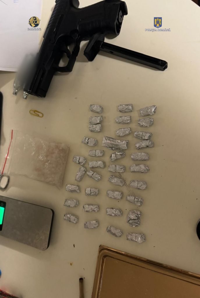 În urma percheziției efectuate la domiciliul acestuia, au fost descoperite și ridicate peste 62 de grame de substanță cristalină (3-CMC, drog de mare risc), o cantitate de canabis (drog de risc), ambalate în doze specifice vânzării, un cântar electronic, un dispozitiv de mărunțit, un pistol de tip airsoft (deținut ilegal, fiind suspus autorizării), obiecte purtând urme de substanță, precum și alte mijloace de probă.